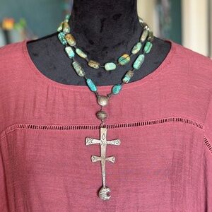 Custom necklace by high end jewelry artisans Love Tokens Jewelry. Elevate your style with this bohemian beaded necklace featuring a striking sterling silver Isleta Cross/Drangonfly pendant. The necklace showcases a blend of green & blue turquoise stones, perfect for adding a touch of elegance to any outfit. The necklace measures 36”, pendant measures 6”, 42” in total length. No closure, this necklace slips over head or use a pin to wear it doubled as pictured.