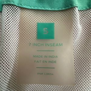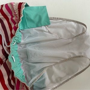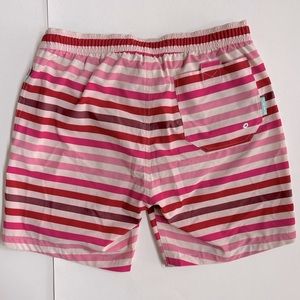Vibrant striped swim trunks. Elastic waistband with drawstring. Perfect for beach or pool. 7 inch inseam