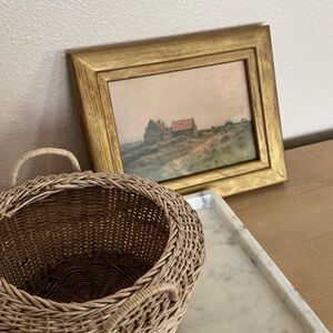 Elegant floral still life art in a gold frame. Features vibrant flowers in blue, pink, and red hues.