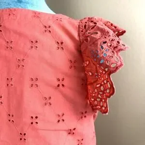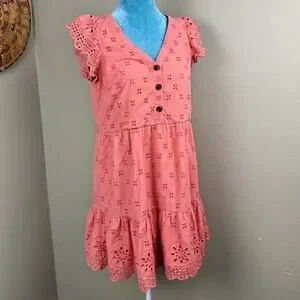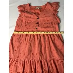 LOFT Ann Taylor 2P feminine empire fit mini-dress in coral peach with eyelet design and embroidered flutter sleeves and hem. Beautiful and flattering fully lined mini dress in breathable cotton. My FLAT measurements are 30” length nape to hem, 18” between axilla (chest is also darted for fit) and 17.5” empire waist. Some pics look orange - this dress is peach / light coral :). Thank you so much for your consideration of this lovely mini dress by Ann Taylor !