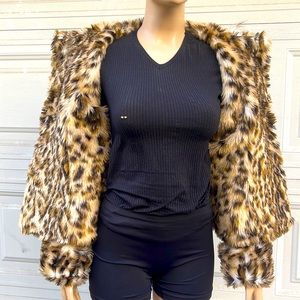 Stylish brown leather jacket. Features animal print trim on collar and cuffs. Single button closure. Perfect for a chic look.