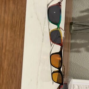 SOLD AS COMPLETE SET: 2 Larkin Pair eyewear frames and 14 toppers - best value! glasses frames have RX in them so the lenses will have to be changed at your optical provider. worn but in very good condition. all the toppers fit and are in good condition. many are new as I only enjoyed a few colors. keep in mind when they are stored flat the toppers can flatten and then the magnets dont reach the frame properly. they are easily bent under warm water to mold to the glasses.