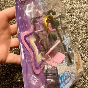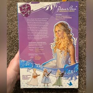 Taylor Swift singing doll in a chic black dress. Features long blonde hair. Includes microphone and guitar. Also includes separate accessory pack. Boxes slightly damaged.