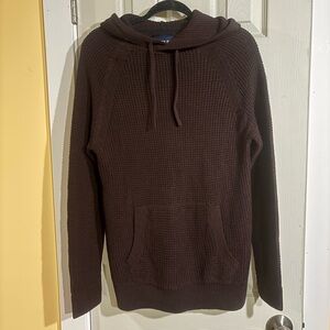 Stay warm and stylish with this cozy brown knit hoodie sweater. Perfect for layering and casual outings.