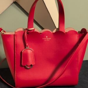 Chic Kate Spade satchel with scalloped edges. Perfect for any occasion. This bag looks like it was never used. Very clean. Few scuff marks. Please enlarge pictures. Not anything noticeable unless you really are looking up close. I honestly can't tell if this is a red or pink color. Approximately 10 x 8 1/2. Thanks for looking and have a great day.