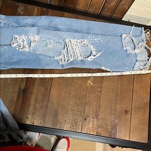 Trendy wide leg jeans with heavy distressing. Light blue denim for a bold style statement.