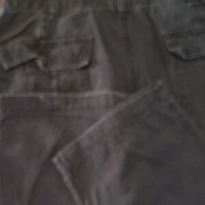 Durable cargo pants with multiple pockets. Ideal for casual wear. Comfortable and stylish. Dark gray pants with a side zipper pocket. Nice pants, can't wear them any more