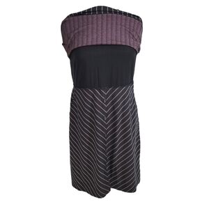 J. Jill Ponte dress in black with red and white pinstripe pattern on the top contrasting the chevron pattern on the bottom skirt. Buttons run down the skirt portion. The top drapes over the skirt for a separates look. Very good condition.