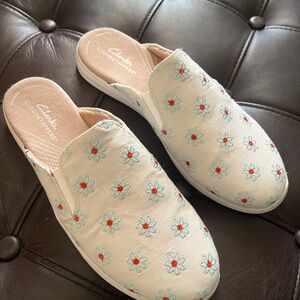 Chic Clarks mules with floral embroidery. Easy slip-on design. Ideal for everyday wear.