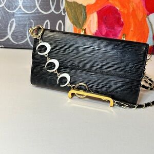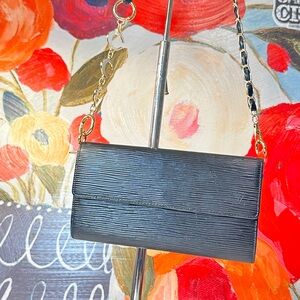 This sophisticated black leather Louis Vuitton epi Sarah is perfect for any occasion. Its sleek design and high-quality material make it a must-have accessory. No sticky no odors good condition is coming with the chain and pendant