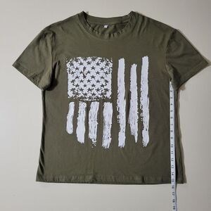 Show off your American pride with this army green women's tee with a distressed flag pattern graphic front design. The stretchy fabric ensures a comfortable fit for all-day wear! Perfect for summer and layering for year-round outfits. Excellent condition-like new.