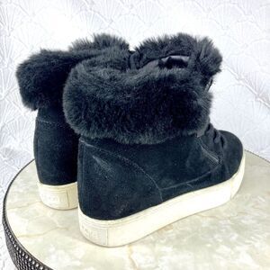 Chic black booties with plush fur accent. Features lace-up front and side zipper. Durable white sole for comfort.