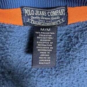 The product is a vintage 90's Polo Jeans Co. Ralph Lauren track jacket in royal blue, with a full zip closure and striped pattern. Made from a blend of polyester and cotton, this men's size M jacket features the iconic Polo Jeans Company logo as accents. Perfect for casual occasions and walking, the athletic-themed jacket is a stylish and comfortable choice for those looking to add a retro touch to their wardrobe.