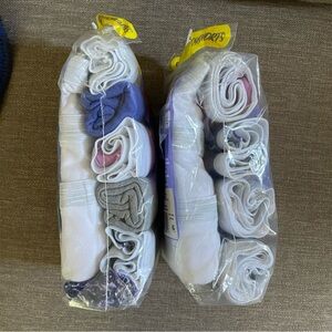 One unopened package contains four white pairs and one each medium blue, pink, gray, dark blue, blue/pink patterned.