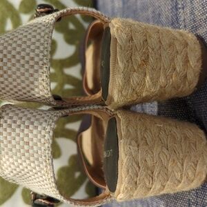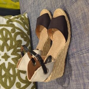 Lucky Brand “Kyndra” black and beige wedge heel sandals, size 7.5
