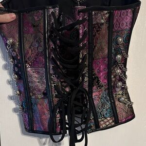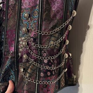 Stand out with this elegant multicolor corset crop top, featuring intricate chain details. Perfect for a bold and stylish look. Steam punk