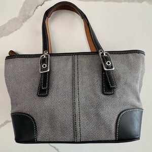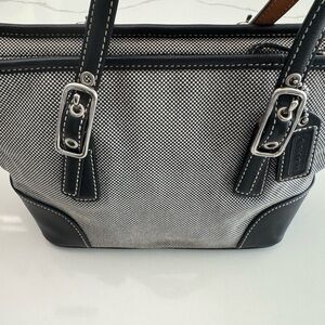 Good used Coach Hampton mini tote bag. Featuring canvas and leather materials. Has general overall used feel, the black and white canvas has some wear, wrinkling, and discoloration. The silver hardware has wear. The inside CC fabric has some black staining. The leather bottom is in great condition with no major scratches. Comes with black hang tag.
