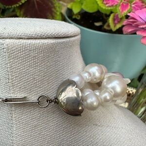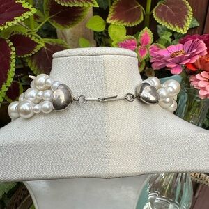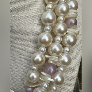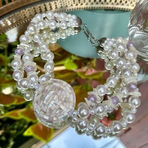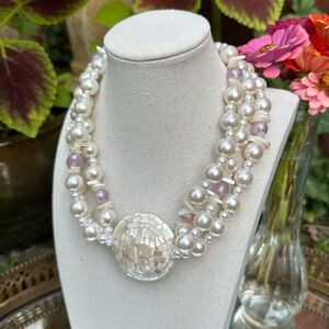 Be still, my heart - this FANTASTIC vintage necklace feels like something a Princess would wear on a moonlit night in a magical forest. A large moon-adjacent mosaic pendant covered in iridescent mother-of-pearl tiles that shine in shades of green, purple, blue and pink is the centerpiece of strands of faux pearls, purple frosted beds and more oil-slick shining chips of natural mother-of-pearl. It's a stunning necklace, straight out of our fairytale wedding dreams. Signed "V.A", indicating this wearable work of art was made in Varese, Italy.