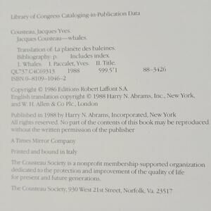Jacques Cousteau Whales by Jacques-yves Paccalet 1988 Hardcover Book