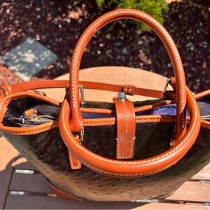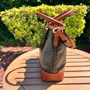 Stylish tote with black and tan design. Perfect for everyday use. Features durable leather and classic look.