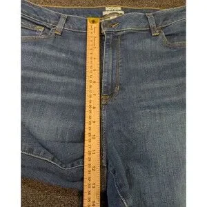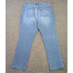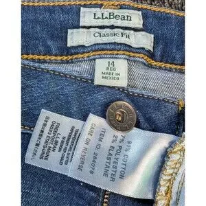 These L.L. Bean women's jeans in size 14 regular offer a classic fit with a high rise and are made of stretch cotton denim in a solid blue color. They feature a zip closure, 5-pocket design, and straight style. Perfect for all seasons, these jeans are both stylish and comfortable, with a hint of outdoor and preppy themes. The versatile blue color and timeless design make them a wardrobe staple for any woman. A8 0336