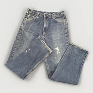 CAbi women’s jeans, size 14. A classic dark wash denim with stylish distressing on the front left leg and back right pocket. High-quality material, comfortable fit, and great style.