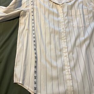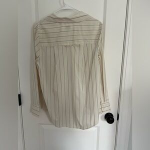 NWOT. Elegant cream shirt with black stripes. Features a classic collar and button-up front. Medium, Never worn. Measurements included in photos.