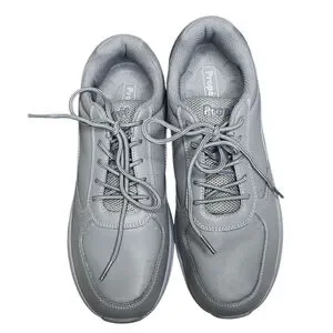 These are pre-owned Propet WAA302L walking shoes, size 10 US. The upper material is leather, featuring a gray color. With high arch support and deep heel cups, these are great for people who suffer from diabetes or plantar fasciitis, as well as anyone who just wants a really comfortable walking shoe. These only show minor signs of wear and in nice gently pre-worn condition.