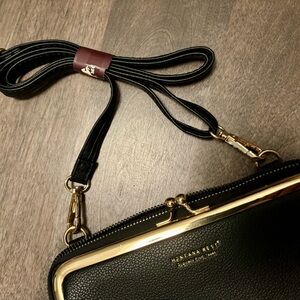 Elegant, soft high-quality black leather crossbody wallet with gold accents. Sleek and durable design. Perfect for any occasion.