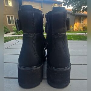 Rugged and stylish Timberland combat boots. Durable leather with secure laces and buckle. Ideal for versatile wear.