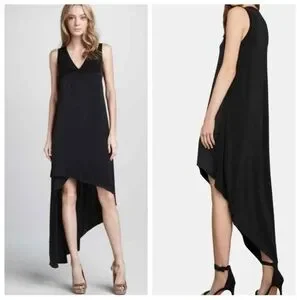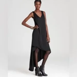 Chic and timeless BCBG Max Azria Avery dress in classic black. Features a sleeveless cut, V-neckline, and dramatic asymmetrical high-low hemline for a sleek, modern silhouette. Perfect for cocktail parties, evening events, or a versatile LBD upgrade.