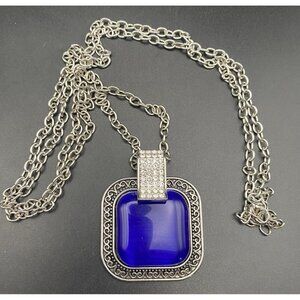 Royal Blue Cat's Eye Pendant Iced Out CZ Hip Hop Silver Tone Chain Cable 34+2"