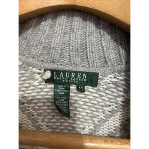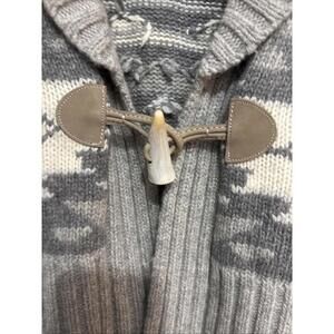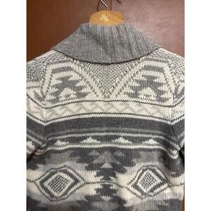 This stunning Lauren Ralph Lauren cardigan is the perfect addition to any wardrobe. The Southwestern pattern in grays and cream is both elegant and unique, making it a versatile piece for any occasion. The shawl collar and cuffed short sleeves add a touch of sophistication, while the toggle button closure and leather accents give it a playful edge.