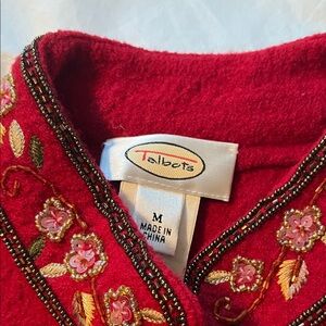 Elegant red women's jacket with intricate embroidery. Perfect for adding a touch of sophistication to any outfit. 100% wool. Like new condition. 18” pit to pit. 24” length. Sleeve length 24”. Pet free smoke free home.