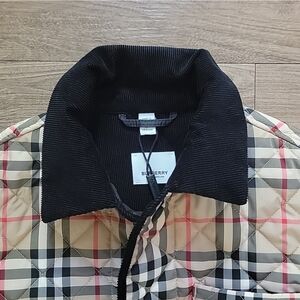 Elegant Burberry jacket in beige plaid. Quilted, with corduroy black detailing and collars. Features black trim and button details. Ideal for a unisex if you ask me, looks great on, timeless style. smoke & pet free home.