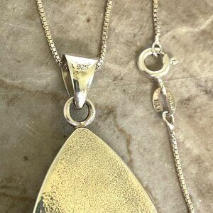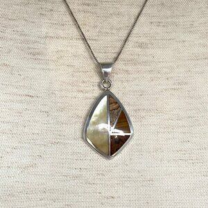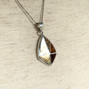Sterling Silver 925 Mother Of Pearl MOP, Landscape Jasper & Tigers Eye Inlay Pendants Necklace