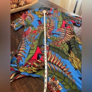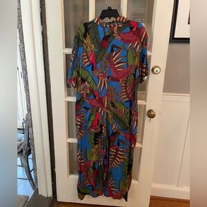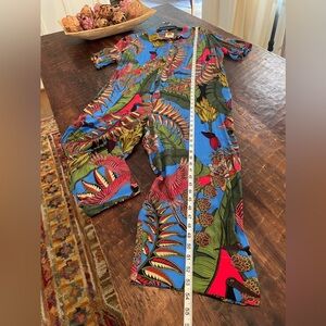 Vibrant blue jumpsuit with bold leaf patterns. Features a relaxed fit and button-up front. Ideal for a stylish statement.