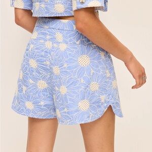 Elegant high waist shorts with a floral design. Features a blend of blue and cream. Ideal for casual outings.