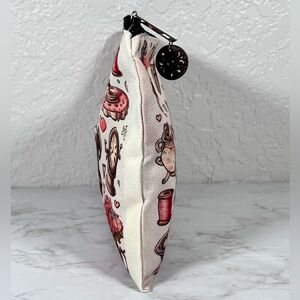 Charming canvas pouch with vintage sewing pattern design and button zipper pull. Features a mix of pink, red, and brown colors.