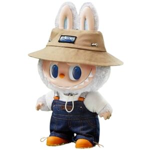 This adorable Labubu is huge with movable eyes, dressed in stylish denim overalls, top, rain boots & fisherman's hat.