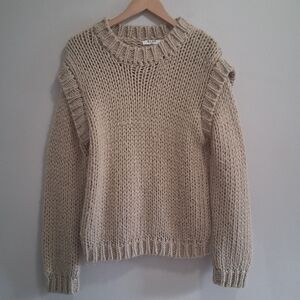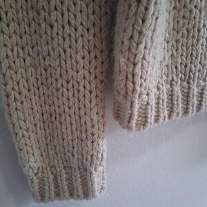 Stay warm and stylish with this cozy beige knit sweater. Perfect for any casual outing.