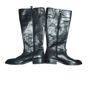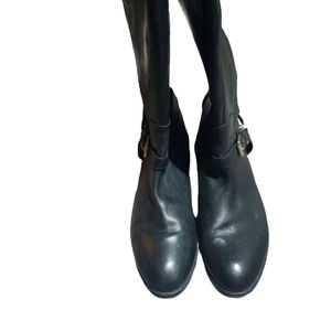 Classic black boots featuring leather construction and gold buckle detailing. Stylish knee-high design. Good preowned condition