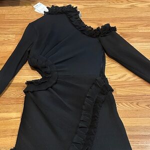 Chic black dress with elegant ruffles. Long sleeves and unique design. Perfect for stylish outings.