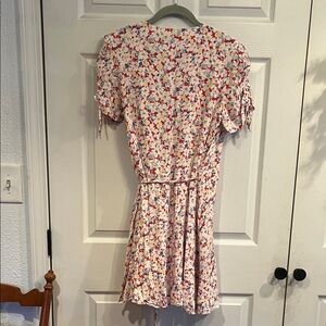 Chic mini dress with colorful floral design. Features a wrap style and short sleeves. Ideal for casual outings.