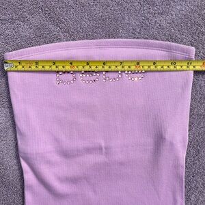Chic lavender strapless top with sparkling rhinestone logo. Has built in lining in top portion