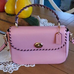 This bag has some light staining on the inside but the outside is very nice. There is also some marks on the clasp that snaps on the bottom from your fingers closing the bag. This bag has an open pocket on the back of the bag and inside there is also an open pocket. A zipper pocket is on the inside of the bag. The bag measures 9 x 8 x 3. It comes with a hangtag although not the original one to the bag. Vintage Coach Spectator bags are not common but the leather on this early bag is beautiful.