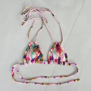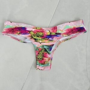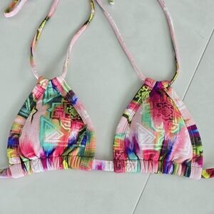 Stand out in this vibrant bikini set with a colorful pattern. Features a triangle top with double straps and matching cheeky bottoms. Both size small. Excellent condition.