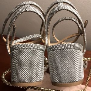 Gorgeous crystal embellished vamp; delicate, thin double wrap ankle strap with buckle closure. The silver textile upper sparkles beautifully! I couldn’t capture the brilliant sparkle of these in the pictures. Comfortable 2-1/2” block heel so you can dance the night away! Textile upper with leather sole.