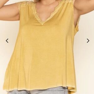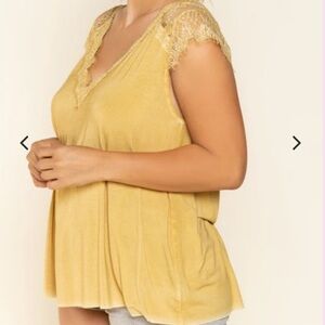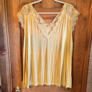 This is the"Sweetheart Confession" knit top from POL. Size 3X. Excellent condition- worn once. Designed in a relaxed fit with deep V-neckline and lace trim detailing on top, contrasting lace fabrication scalloped sleeve and finished with raw hem. So soft and stretchy. Color is like a faded goldenrod. Stock photos at end. Great for layering!