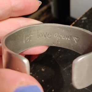 Pewter Cuff Engraved Bracelet with Heart, Flowers and Branches Handcrafted Nature Inspired Bangle